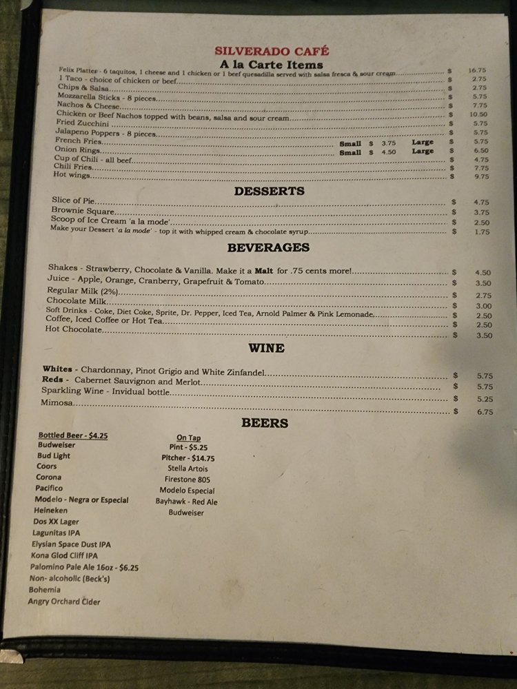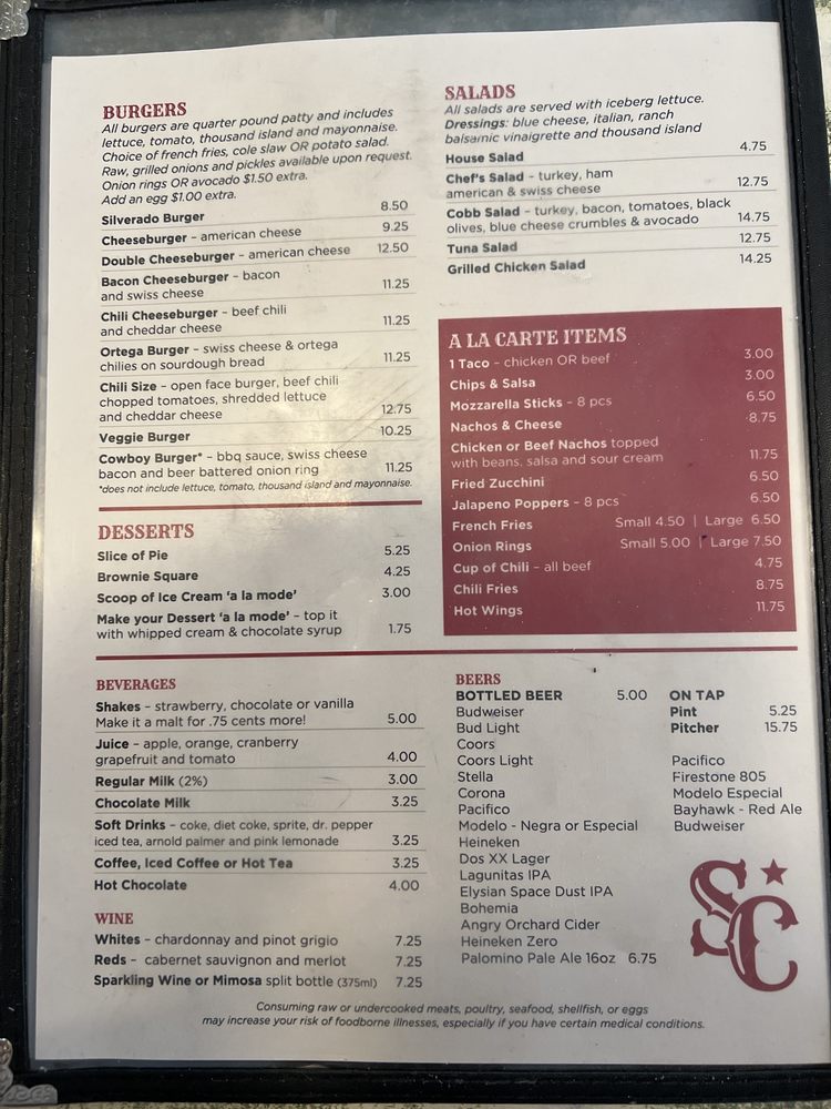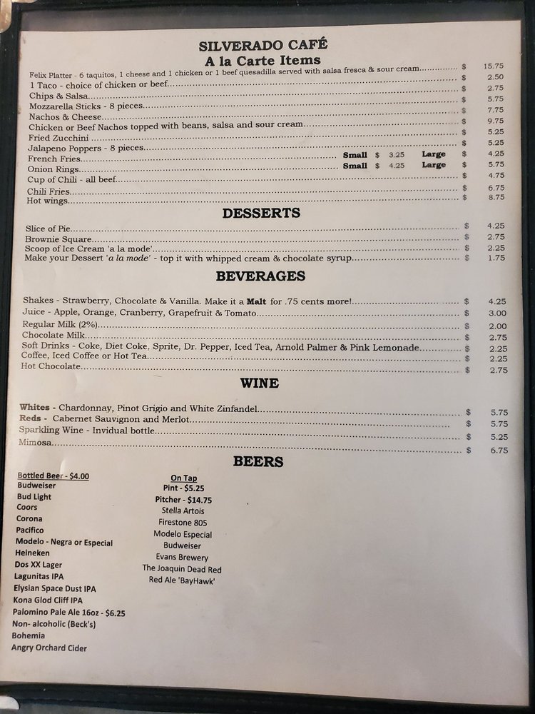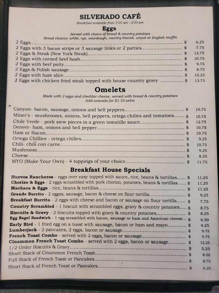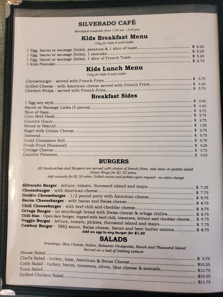 Silverado Cafe is a charming gem nestled in Silverado Canyon, CA, offering a variety of delicious dishes in the categories of Burgers, Breakfast & Brunch, and Mexican cuisine. This cozy cafe provides a unique dining experience with its rustic decor and laid-back atmosphere. The menu boasts a wide selection of options, including the popular Steak and Eggs breakfast, Tuna Melt with onion rings, Eggs with chorizo, and flavorful Al Pastor Burrito. The friendly staff and excellent service create a welcoming environment for guests to enjoy their meals. With options for takeout, delivery, and catering, Silverado Cafe caters to a range of dining preferences. Don't miss out on the opportunity to indulge in their scrumptious offerings and soak in the local camaraderie at this hidden culinary treasure.